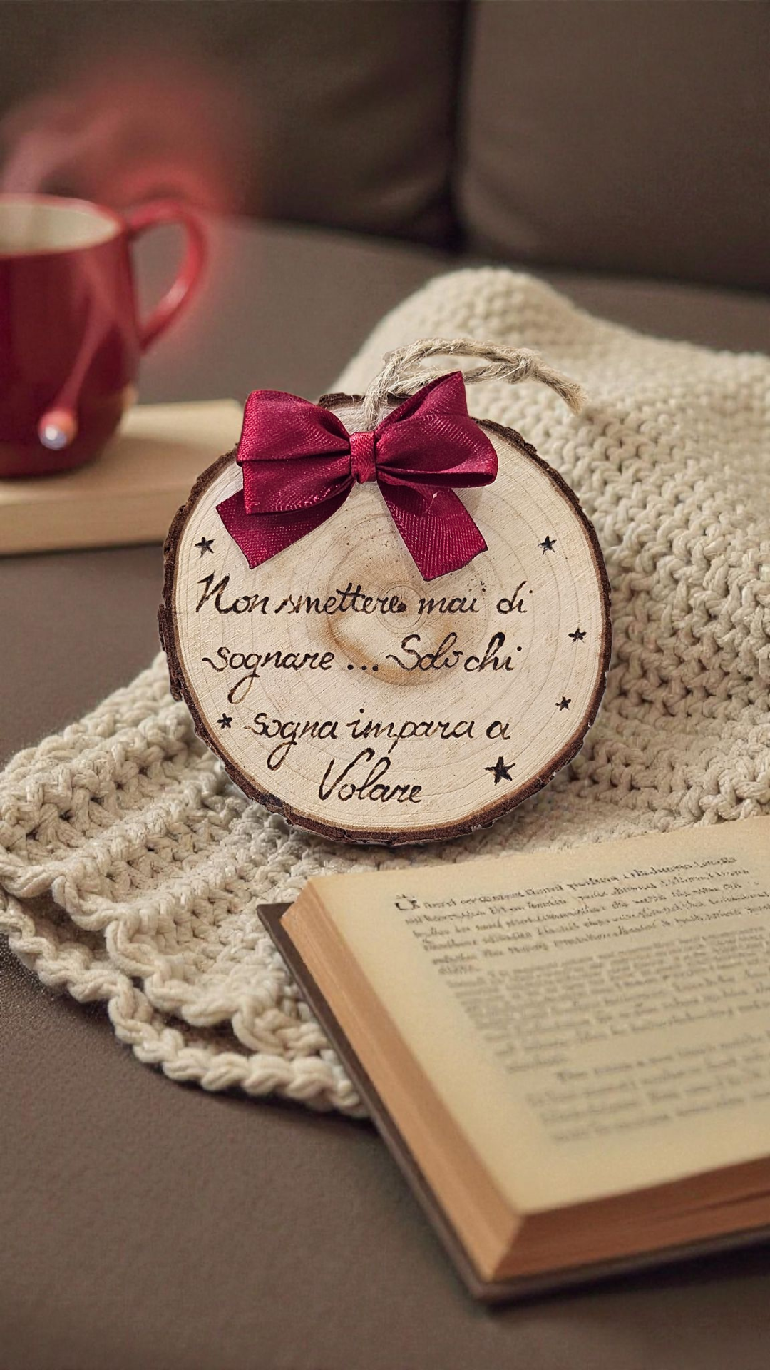 Un raffinato dischetto in legno con calamita sul retro, inciso e decorato a mano con una frase speciale per sorprendere chi come noi crede ancora nei sogni!. Un pensiero dolce, unico e artigianale, perfetto per emozionare.