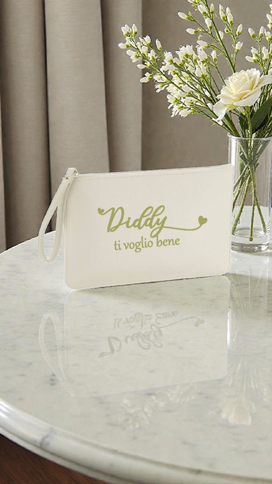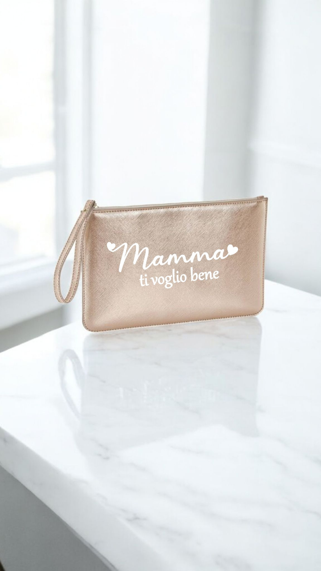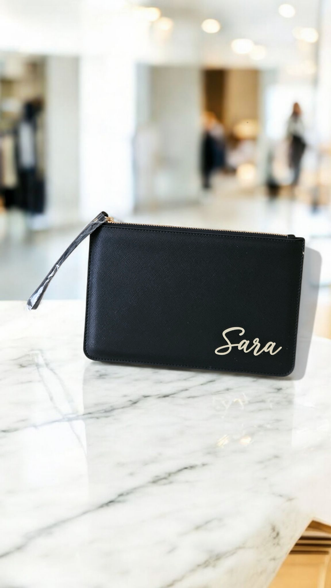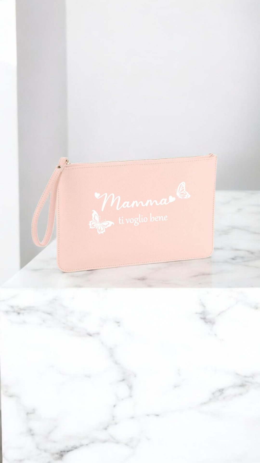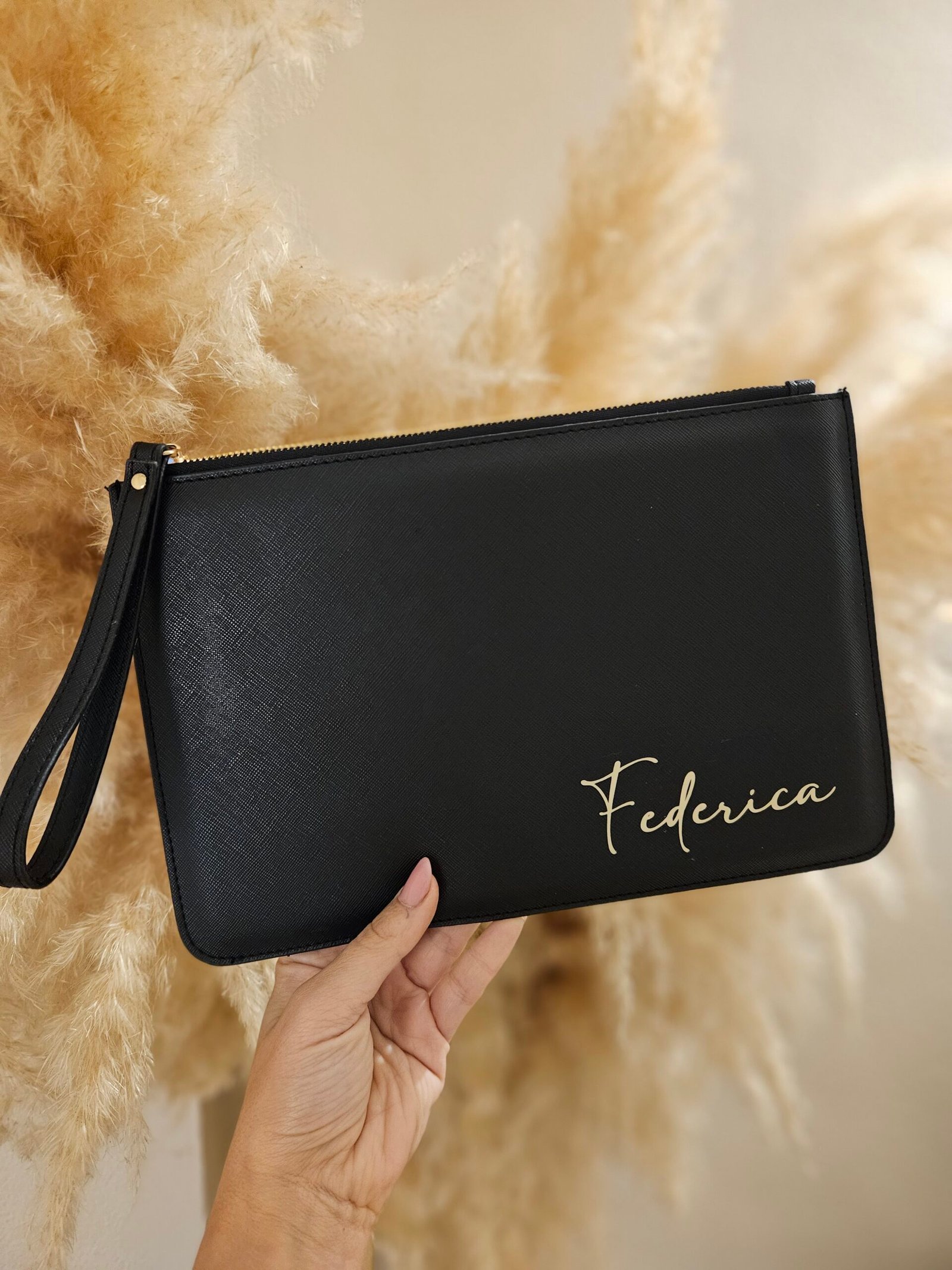 Elegante pochette realizzata in pelle saffiano sintetica di alta qualità, personalizzabile con il nome, o una breve dedica. Un accessorio raffinato e pratico, perfetto come idea regalo e ideale per custodire con stile tutto il necessario.