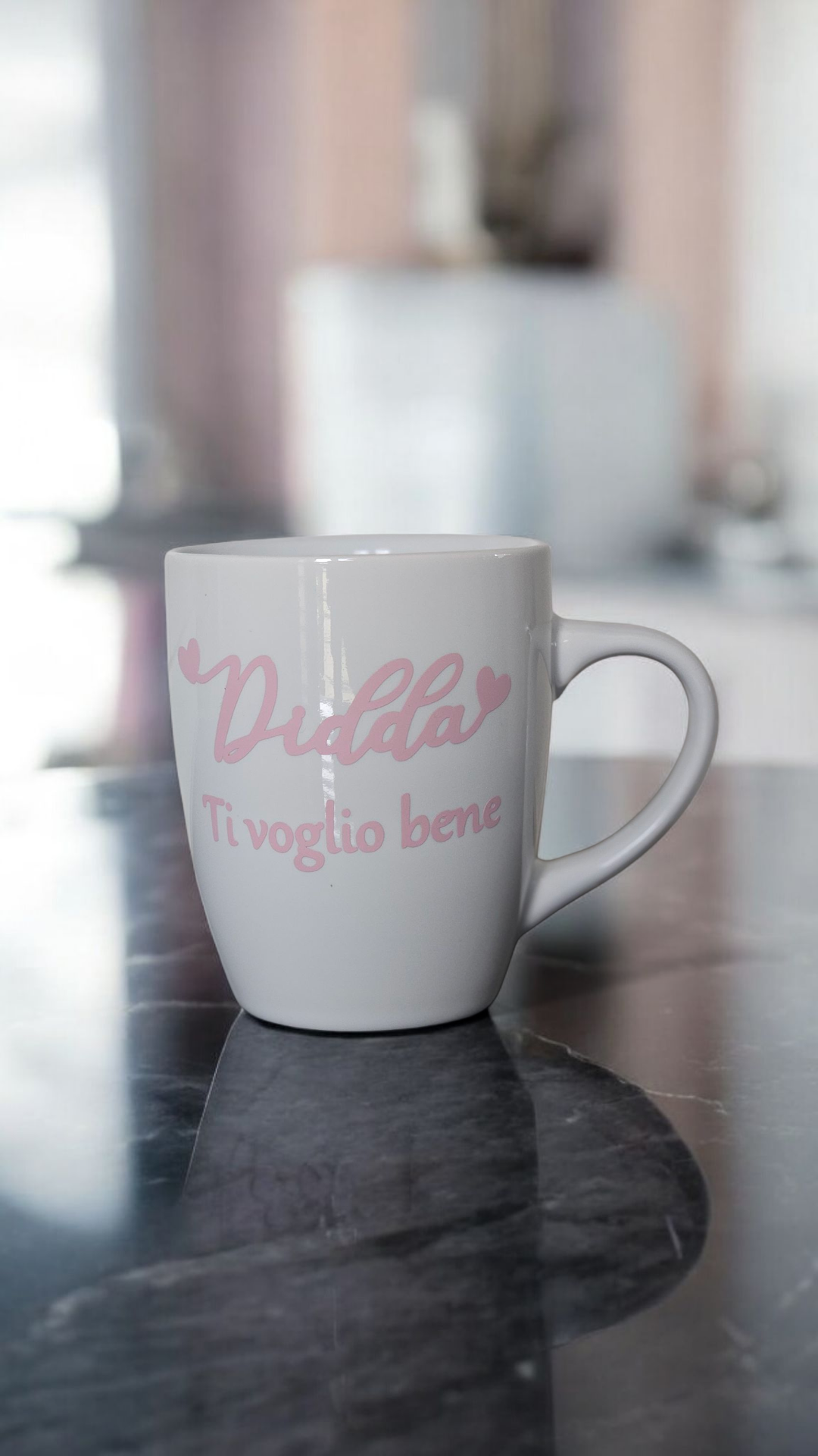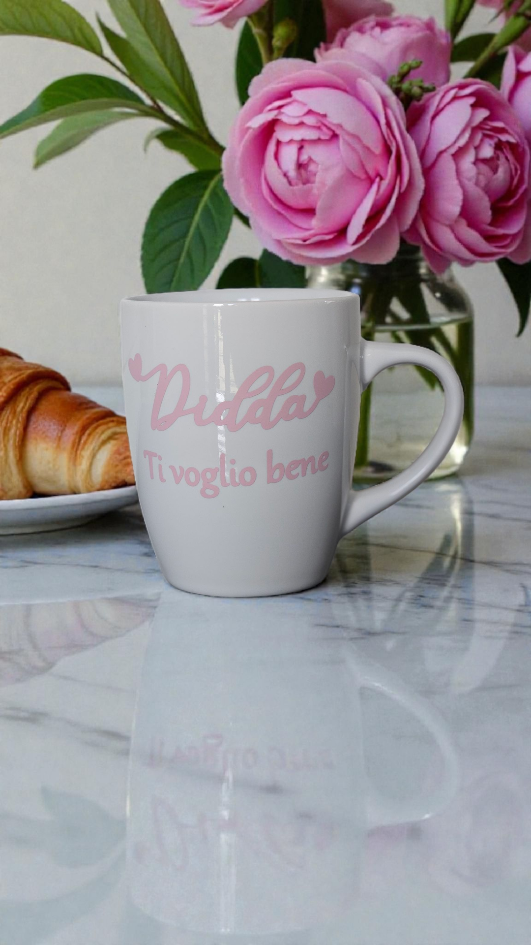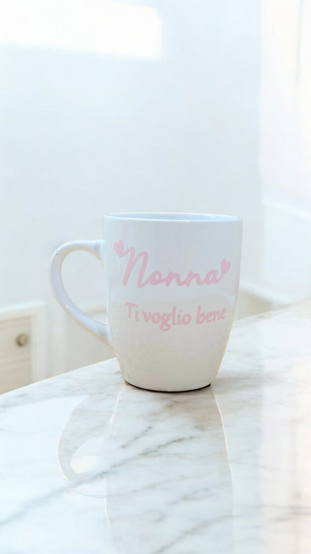 Ogni tazza è personalizzata con una scritta permanente adesiva, resistente all’uso quotidiano e pensata per durare nel tempo senza sbiadire.