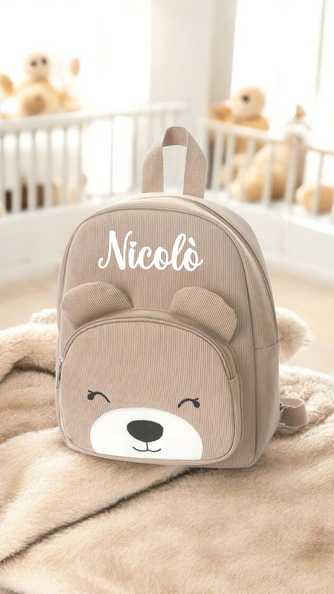 Rendi ogni giornata del tuo bimbo più dolce e speciale con questo adorabile zainetto baby dal tenero visino di orsetto! Perfetto per l’asilo, le passeggiate o i viaggi, è capiente e pratico, grazie alle spalline regolabili e alla taschina esterna, ideale per tenere separati gli accessori più piccoli. Può essere reso unico e facilmente riconoscibile aggiungendo il nome del tuo bimbo!